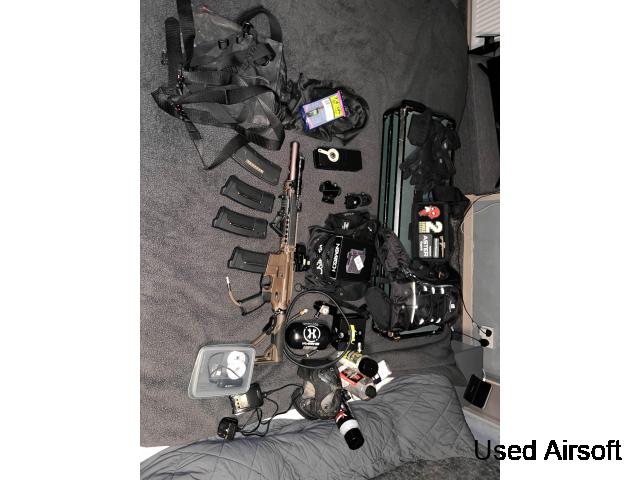 ALL accesories such as bucket hat, both face protections and mechanix gloves are included. Sights and flashlights are included but the holographic is just a chinese knockoff and only needs batteries to work.